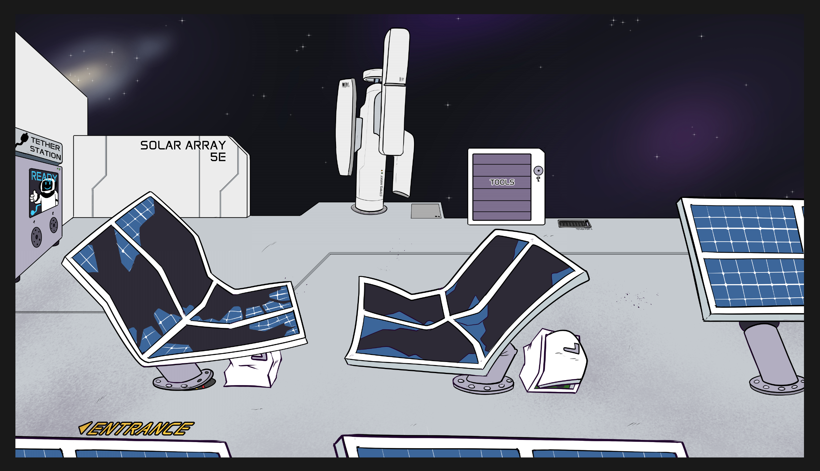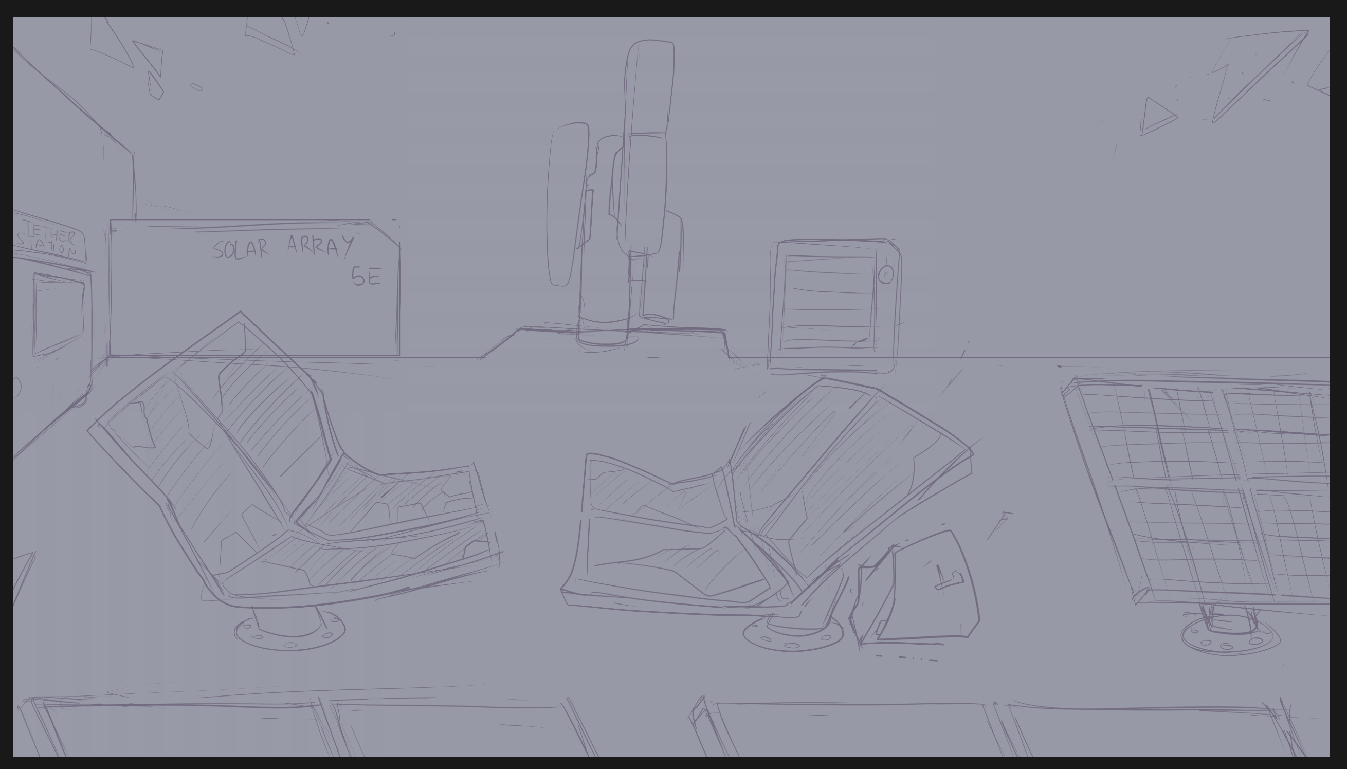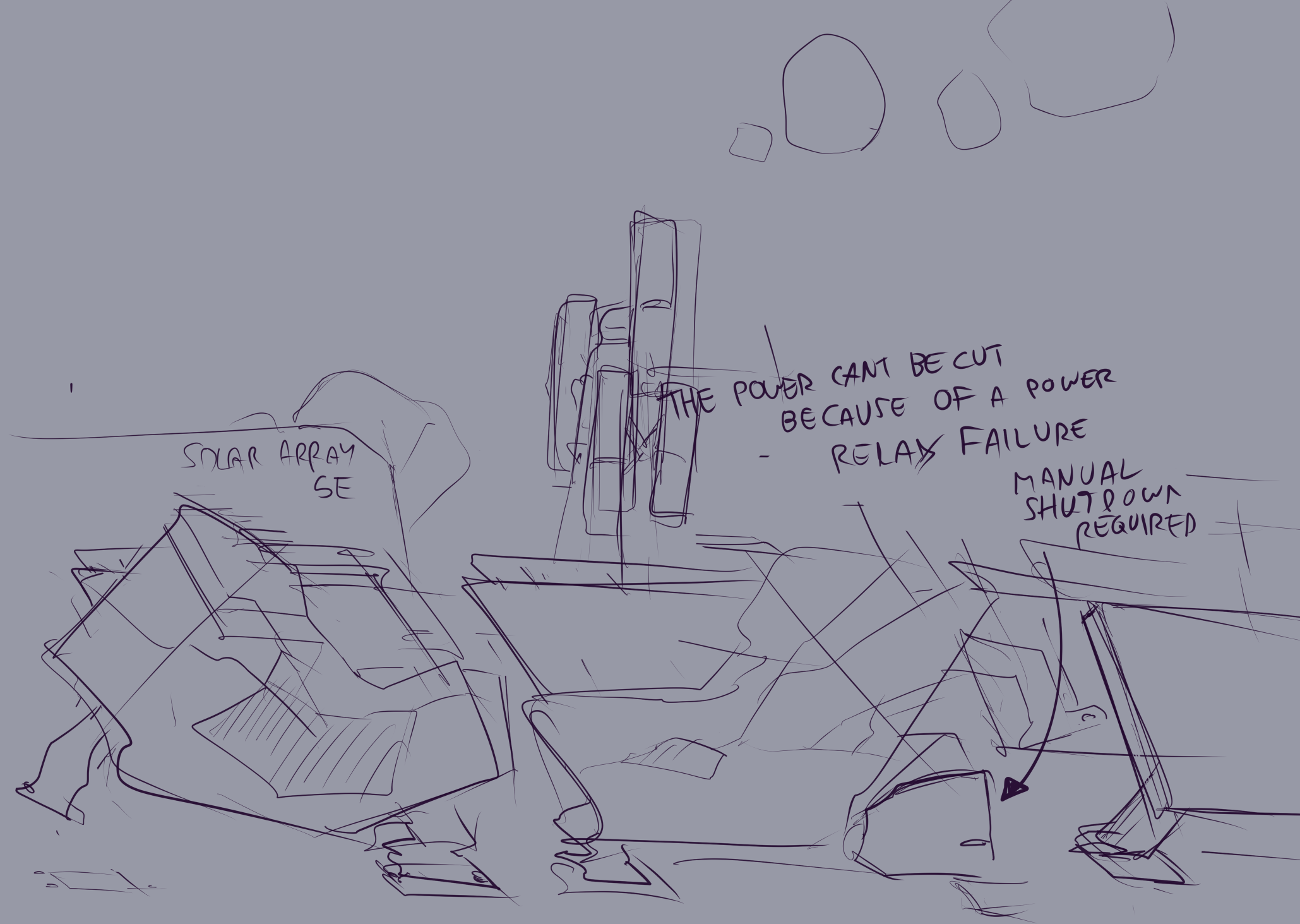A second sketch pass then follows, this is more detailed and you can see already see some decisions were taken to accommodate the game engine: the solar panel legs have been simplified and the spacing between panels is increased to allow the character to move around more easil and some more objects have been added for both flavor and puzzle solving, more panels have been added in the foreground to make you feel like there's much more just outside of view